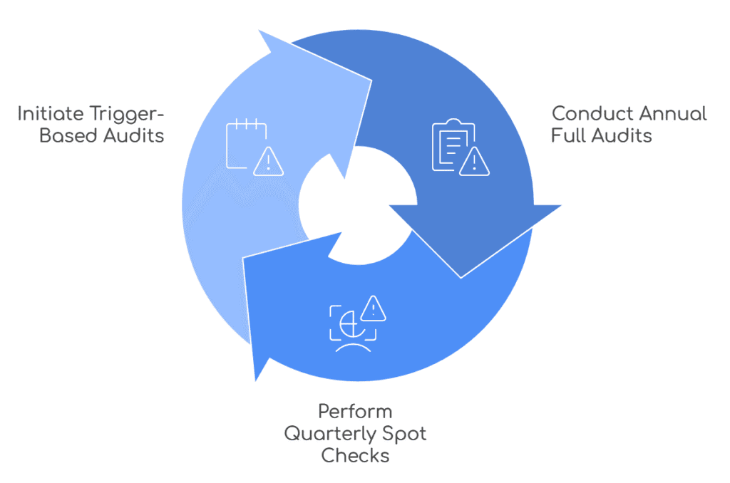 - Trigger-based audits when there are significant changes, such as new laws, restructuring, or rapid headcount growth