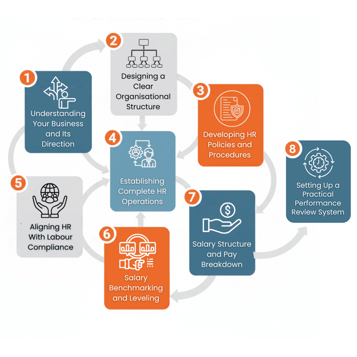 Before designing any part of the HR system, we invest time in understanding your organisation’s purpose, goals, and long-term plans. This discovery phase allows us to build a people system that matches your strategy.