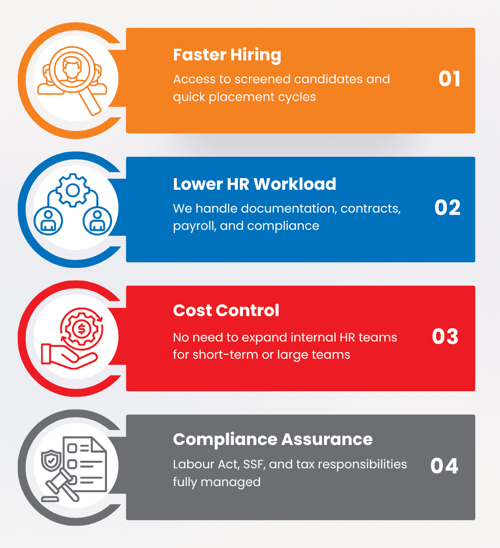 As a licensed HR company in Nepal and a member of the Global Payroll Association, we bring strong compliance knowledge, organised systems, and a large talent network to ensure your staffing function runs smoothly